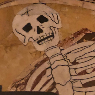 The characters gaze upon the very dramatic "The Beheading of John the Baptist" and "St. John Writing" The paintings are located in a nave that is very, dark and throbbing with one million visitors. The camera pans to show the works of art and also of the amazing floor tiles which feature rather jovial skeletons.